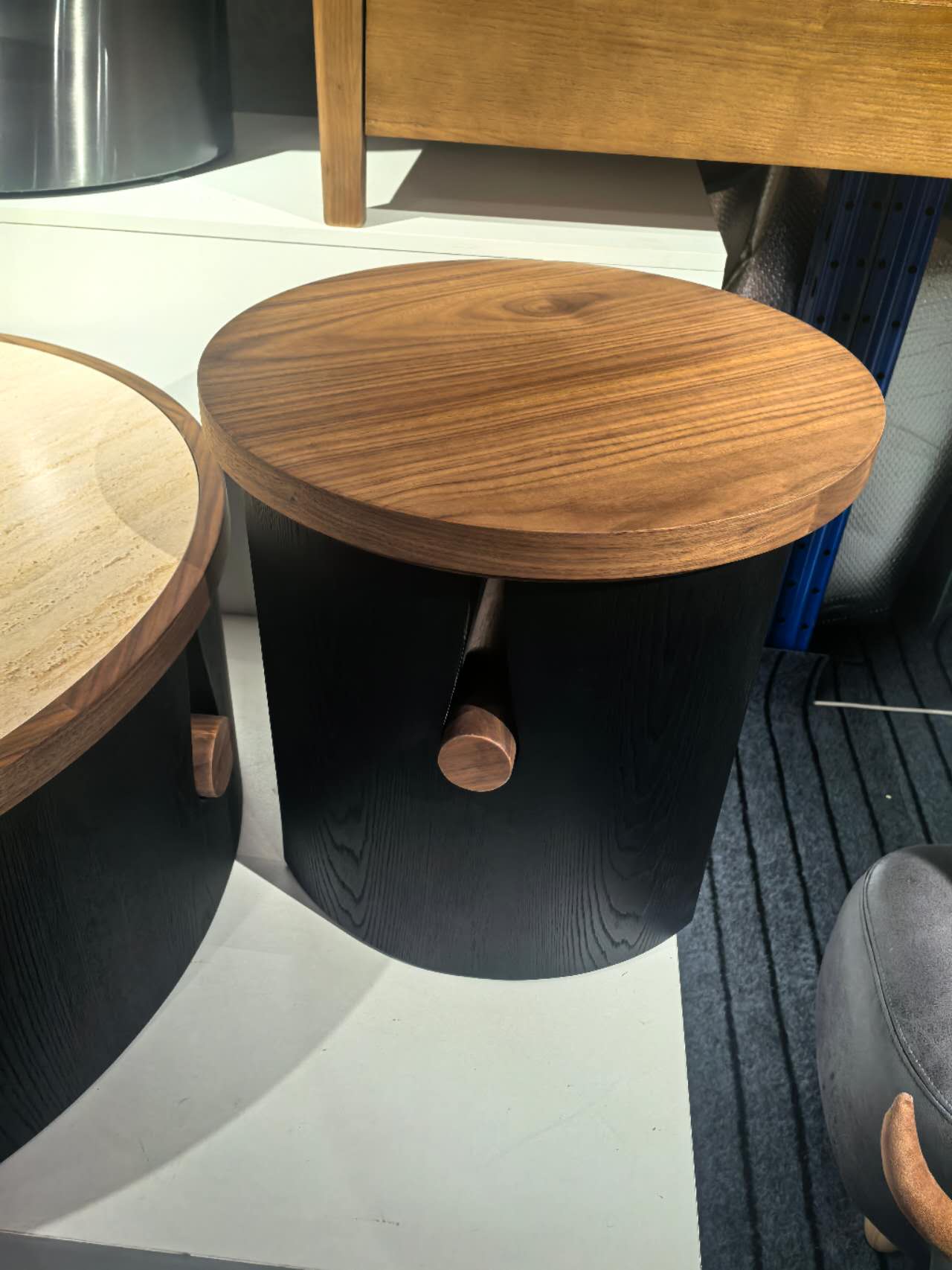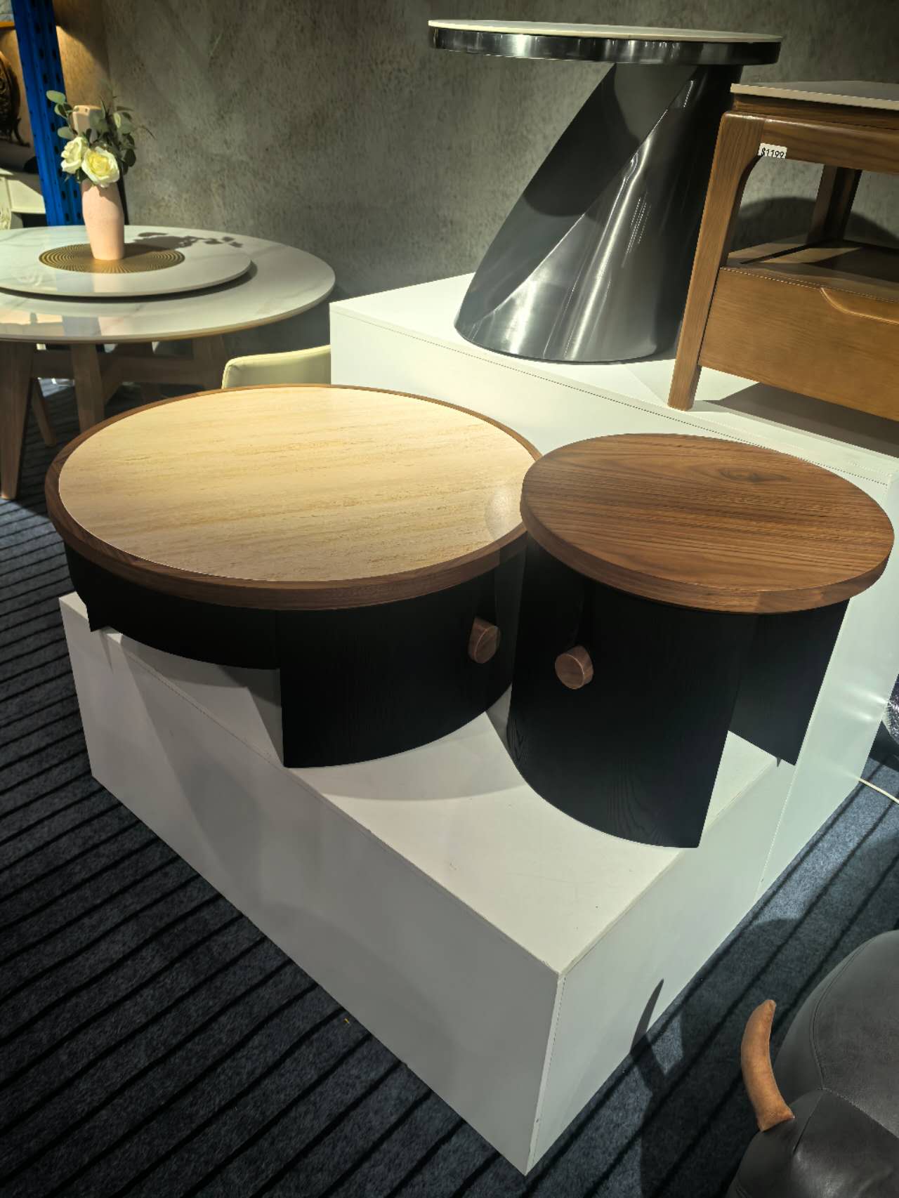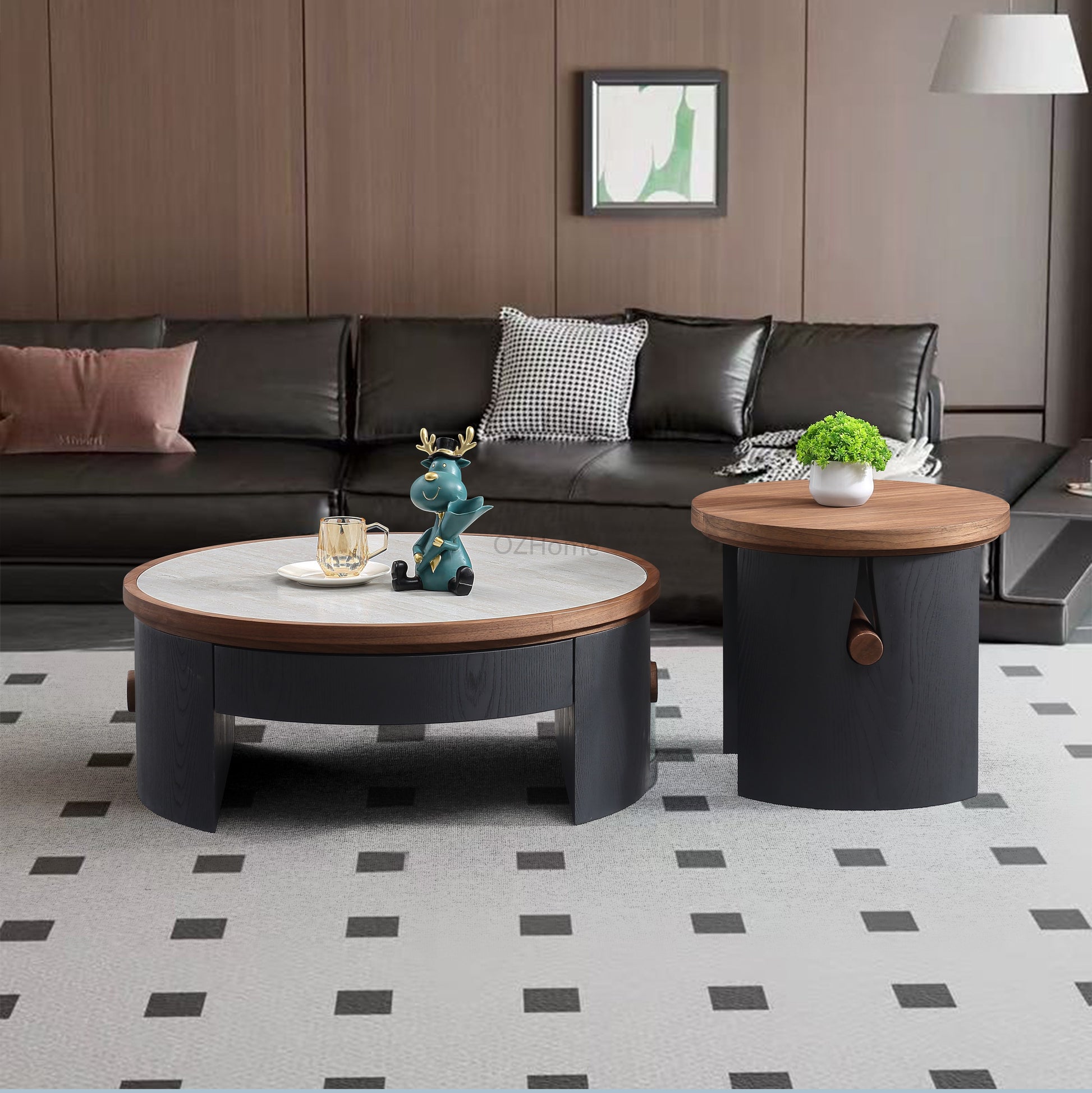 Crafted from premium solid wood and multi-layer boards, the tables showcase warm, natural wood grain and are accented with sleek black frames for a refined designer look. Each sand-colored tufa stone tabletop displays unique, flowing natural patterns, adding an artistic touch. The staggered double-circle layout enhances visual depth while offering flexible functionality for display, storage, and everyday use.