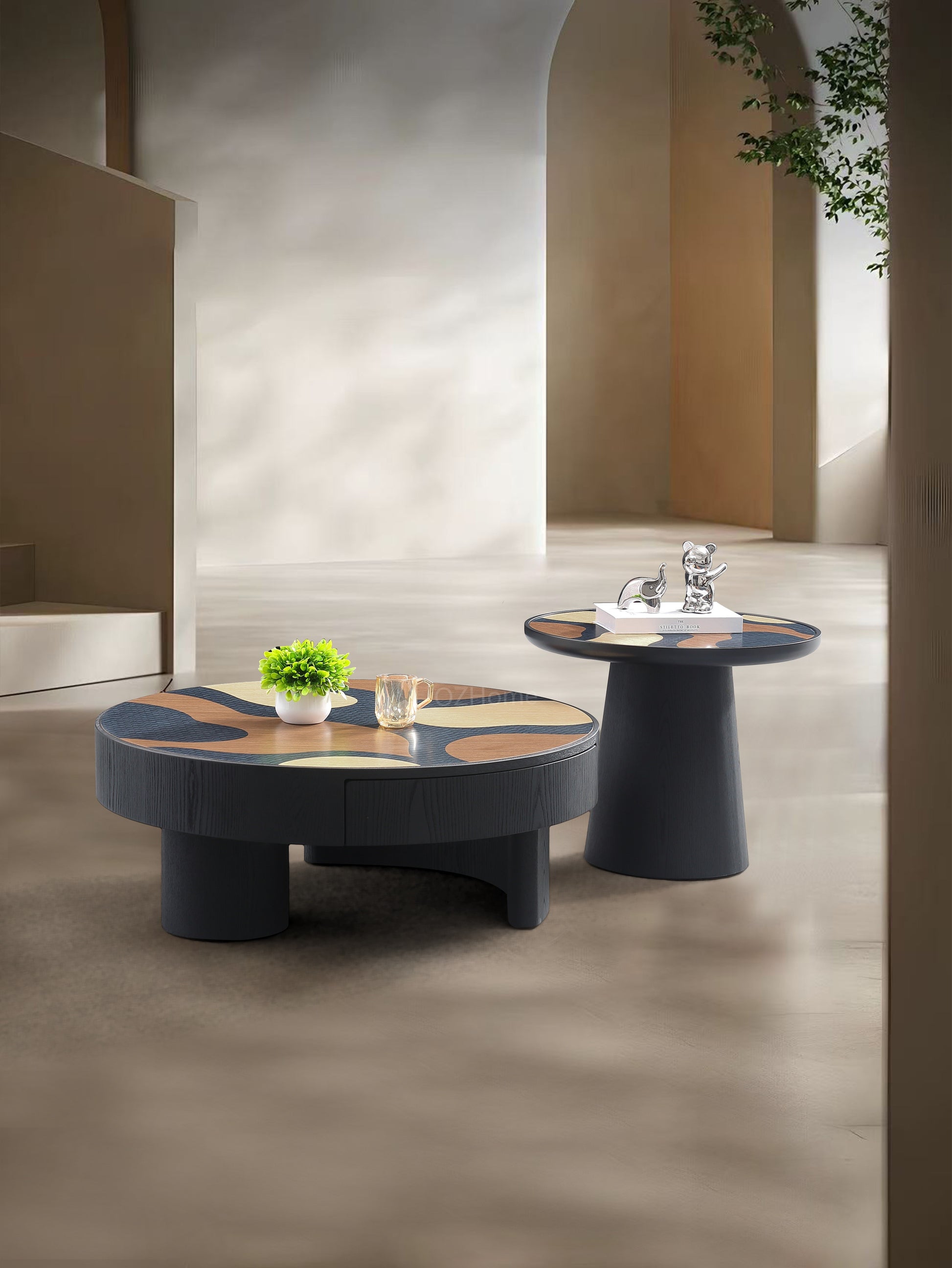 TRIOGRAIN Three-Tone Solid Wood Inlay Round Coffee Table & Side Table Set – 5070